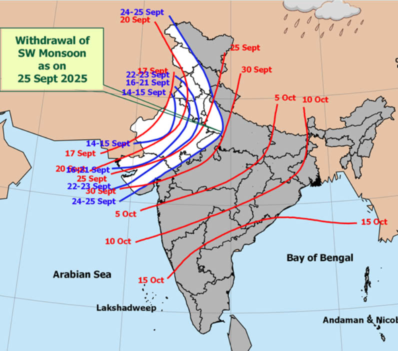 25 सितंबर की स्थिति में मानसून की वापसी की रेखा रामपुर, बुशहर, हरिद्वार, मुरादाबाद, इटावा, बांसवाड़ा, वल्लभ विद्यानगर और वेरावल के पास है। शुक्रवार को इसके और पीछे आने की संभावना है।
