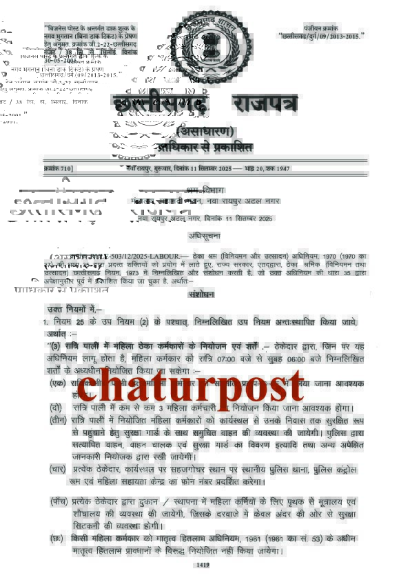 women worker रायपुर। छत्तीसगढ़ में महिला कर्मचारियों को लेकर कानून में बड़ा बदला किया गया है। सरकार ने महिïला वकर्स से रात में काम करने के नियमों को सख्त कर दिया है। सरकार की तरफ इसकी अधिसूचना जारी कर दी गई। इसके साथ ही यह बदलाव लागू हो गया है।